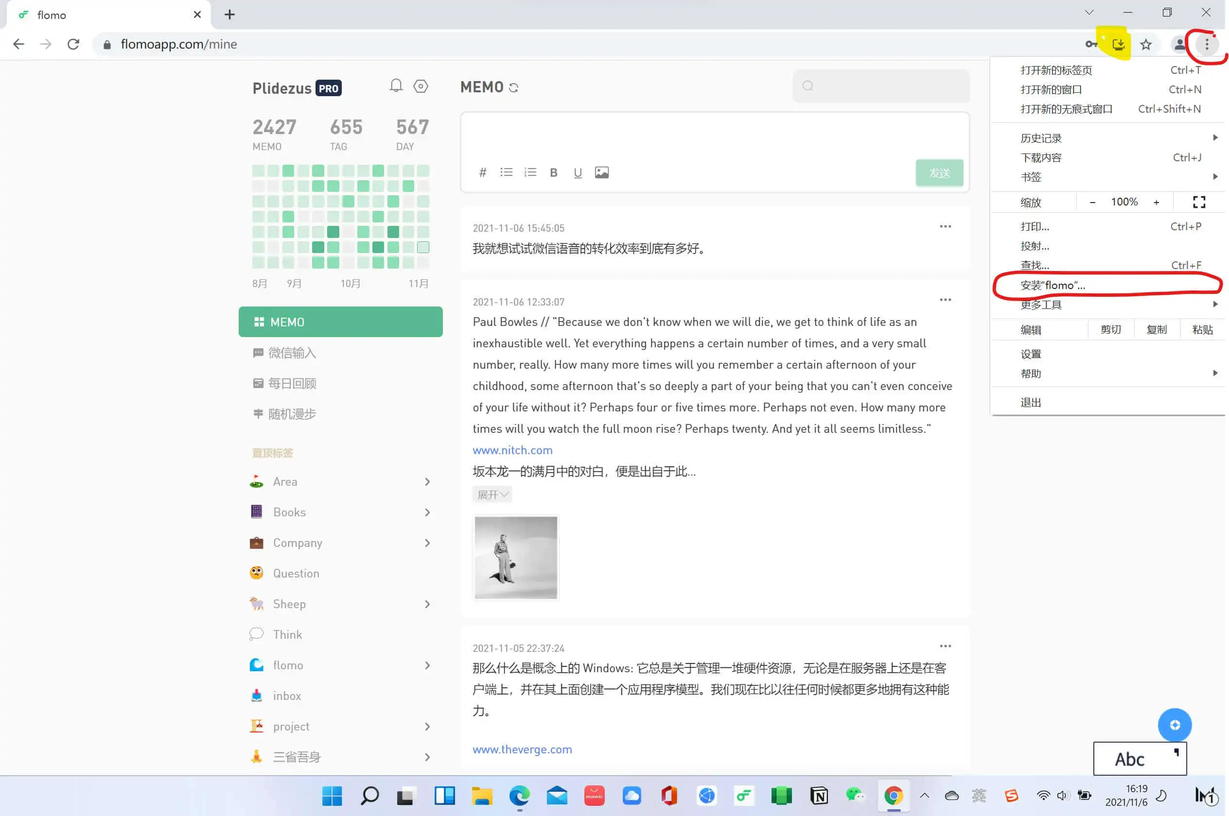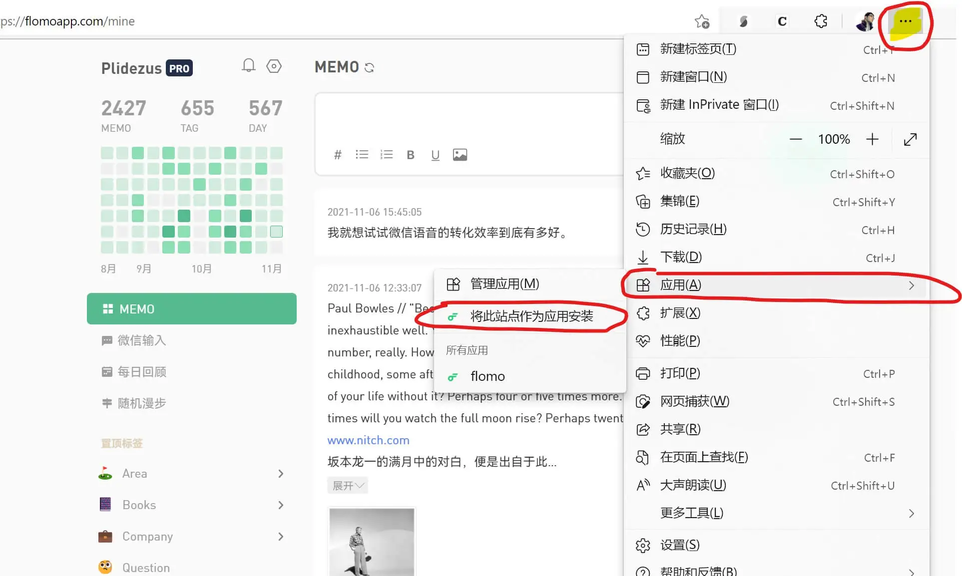 flomo 支持 PWA(渐进式网络应用),在任意平台,可以用 Chrome/Edge 浏览器,可以直接创建为应用程序,体积小巧,打开速度更快,同时还支持离线访问。